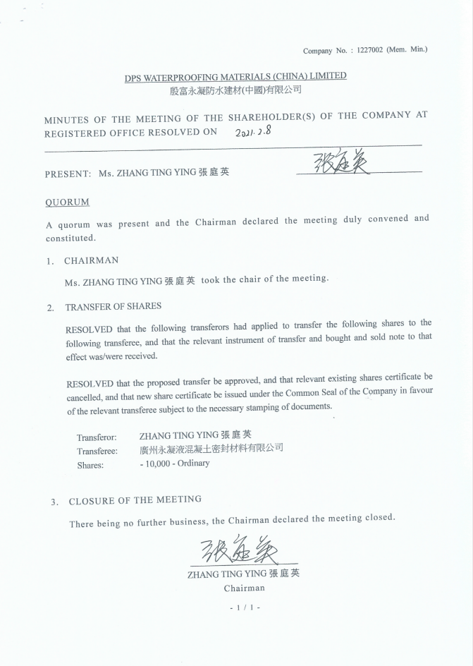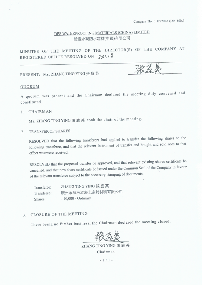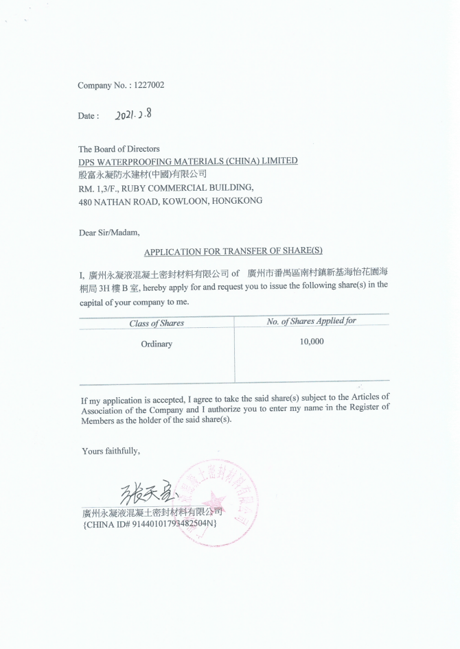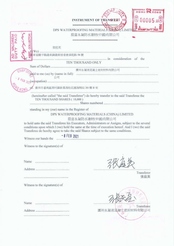 广州永凝液混凝土密封材料有限公司于2021年2月8日取得殷富永凝防水建材(中國)有限公司100%控股。