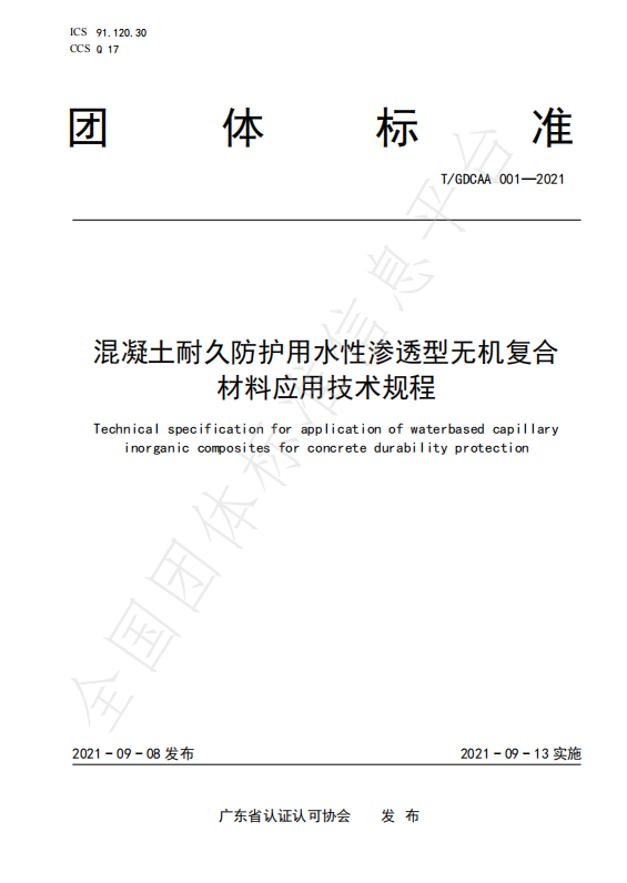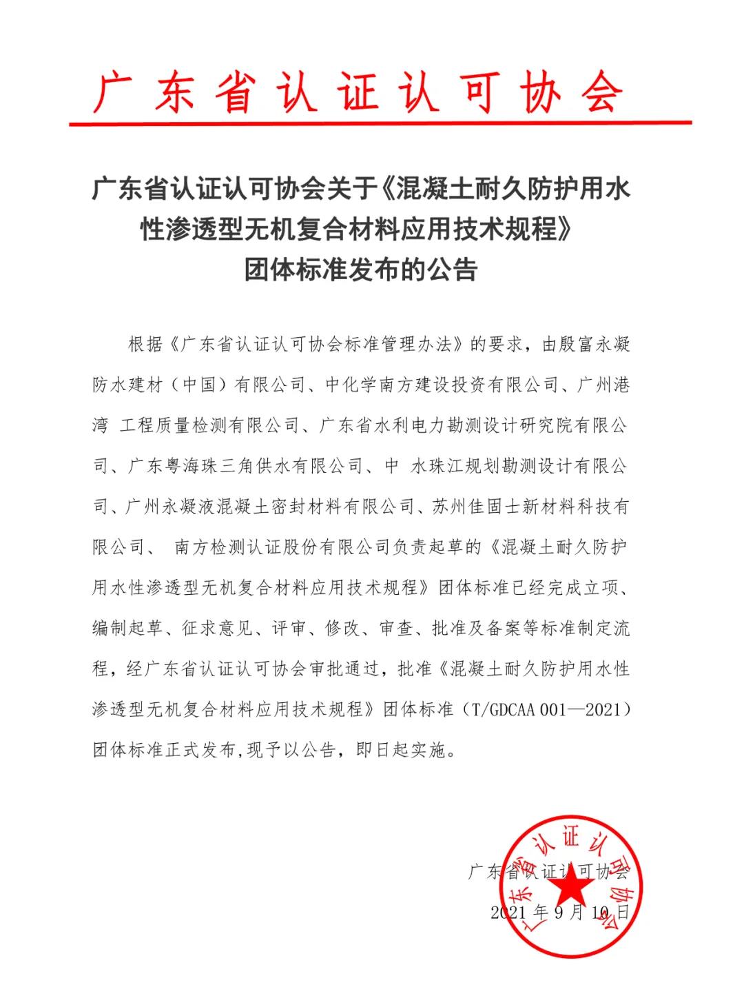 9月10日,广东省认证认可协会发布公告:由殷富永凝防水建材(中國)有限公司、广东省水利电力勘测设计研究院有限公司、中化学南方建设投资有限公司、广州港湾工程质量检测有限公司、广东粤海珠三角供水有限公司、广州永凝液混凝土密封材料有限公司等单位起草的《混凝土耐久防护用水性渗透型无机复合材料应用技术规程》团体标准(T/GDCAA 001—2021)审批通过,正式发布,即日起实施。