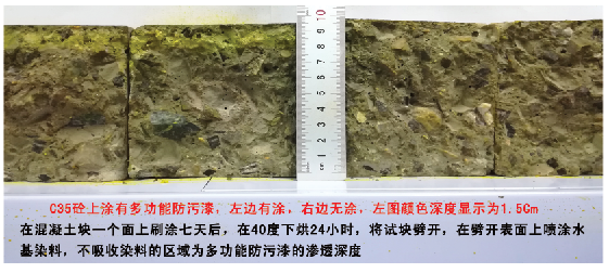 多功能防污漆是一种有机硅聚乙烯树脂,特别适用于多孔、已碳化及疏松的混凝土表面,它能渗入混凝土和砂浆表面达10mm以上,增加混凝土表面强度;并于表面形成一层坚韧的保护膜,该保护膜与混凝土表面紧密连接在一起,不产生分层、剥离,起到防水、防腐及防有机溶剂的作用。它作用于混凝土表面时,可密封2mm以下的裂缝,而作为界面剂作用,能与多种材质面层紧密结合。此外,由它调制的面漆,具有良好的装饰功能,可广泛应用于混凝土工程的装饰,对混凝土的耐久性具有优越的防护作用。